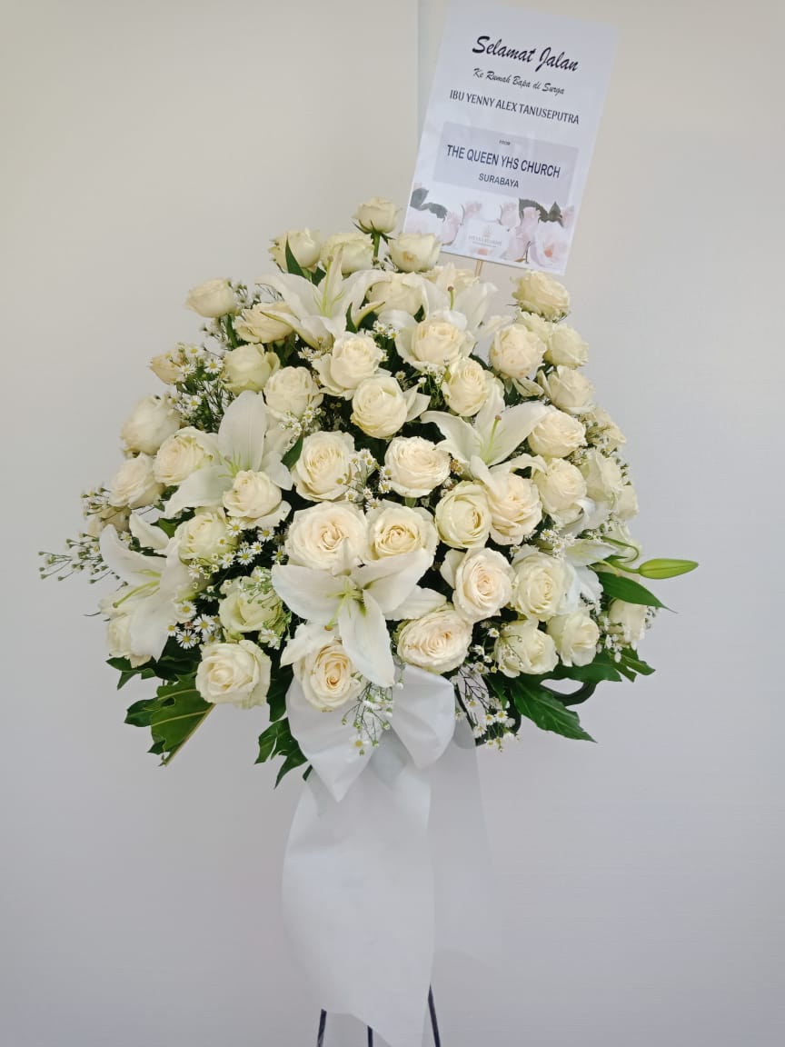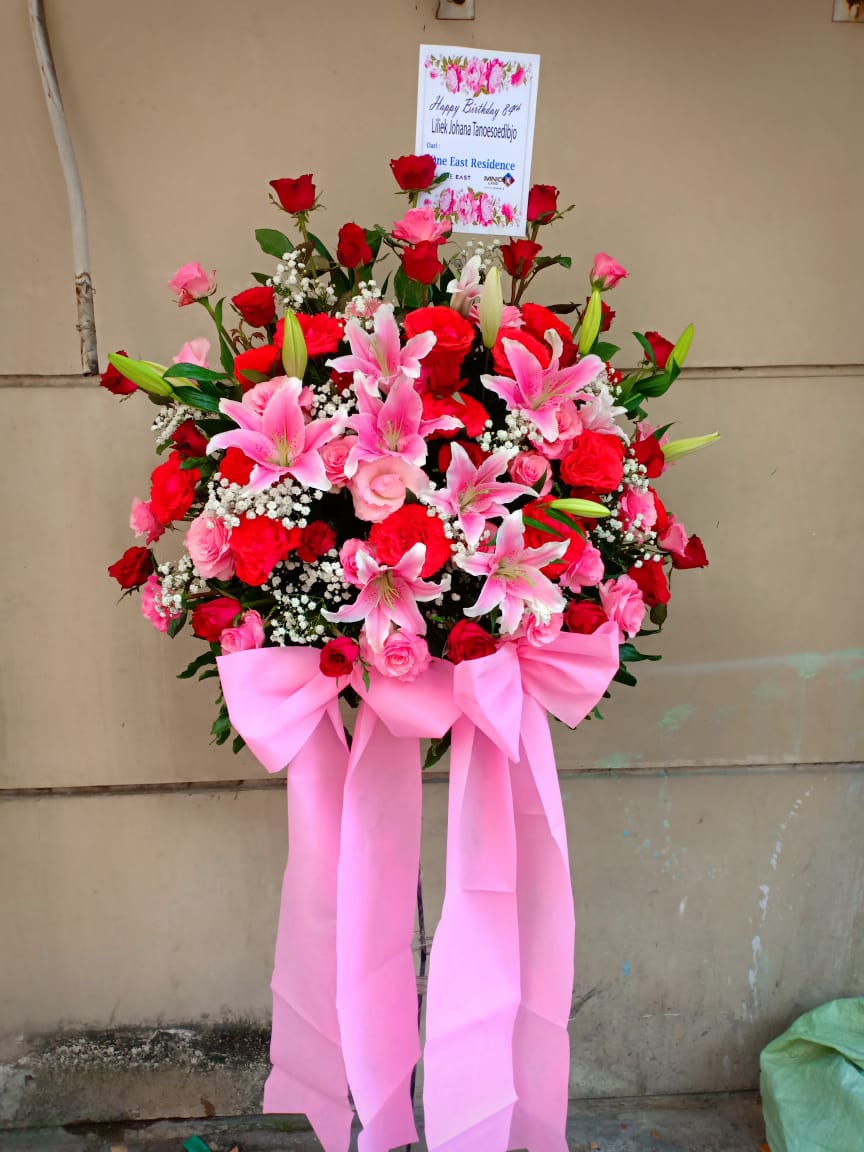 Bunga ucapan berisikan kata kata dukacita, selamat bahagia, semoga sukses, happy wedding, anniversary, graduation, congratulation.